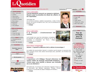 lequotidien-tn.com est le site officiel de journal tunisien Le Quotidien, un journal en langue française ayant but primordial de mettre à la portée des tunisiens toutes les nouveautés et les actualités avec plus de proximité et en restant à la veille régulière. Un ensemble de rubriques sont présentes sur le site avec d’autres informations pratiques.