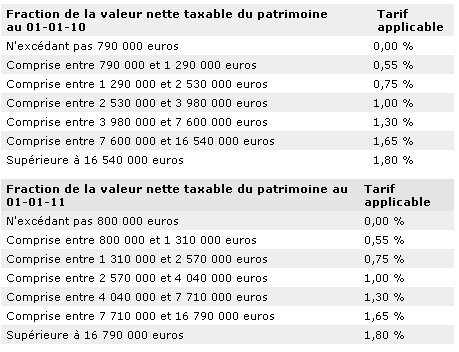 L’impôt de solidarité sur la fortune (ISF) est parmi les impots impliqués en France afin de créer de la solidarité au sein de la société qui sera au profit des personnes en situation de difficulté. Chaque année, le foyer fiscal détermine un nouveau seuil imposable sur le patrimoine de toute personne physique. Pour 2011, toute personne ayant une fortune de 800 000 euros doivent payer cet impot suivant les indications de barème appliqué dans le tableau suivant: